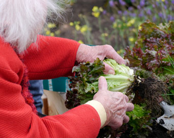 Kräuter und Gemüse werden gemeinsam geerntet und verarbeitet, und es entstehen zusammen bunte Blumensträuße und Pflanzengestecke.