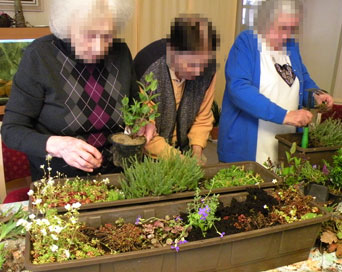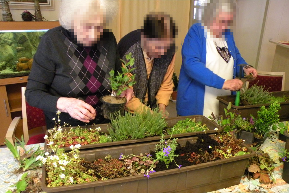 Die Teilnehmenden der „Grünen Stunde“ treffen sich regelmäßig, um Zeit mit gärtnerischen Tätigkeiten zu verbringen. Unter meiner Anleitung werden gemeinsam Kübel und Kästen bepflanzt. Es wird pikiert, gepflegt, gegossen und geerntet.